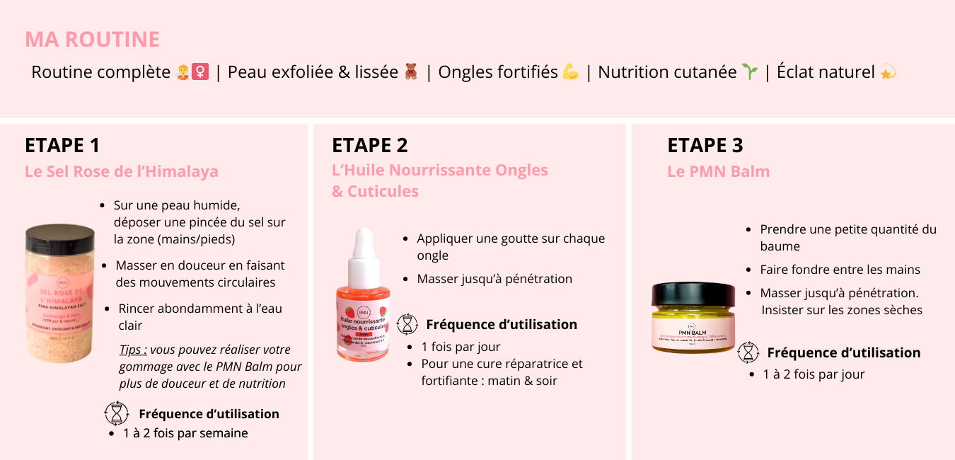 Vos produits : L'huile nourrissante ongles & cuticules (parfum au choix) + Le PMN Balm + Le sel rose de l'Himalaya